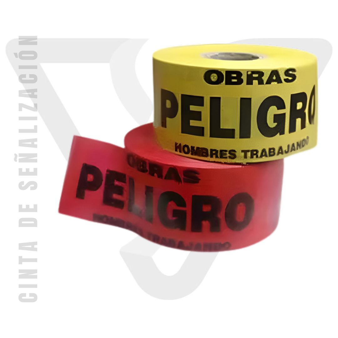 Cinta delimitadora con leyenda de “Obras PELIGRO Hombres Trabajando” color rojo y amarillo.